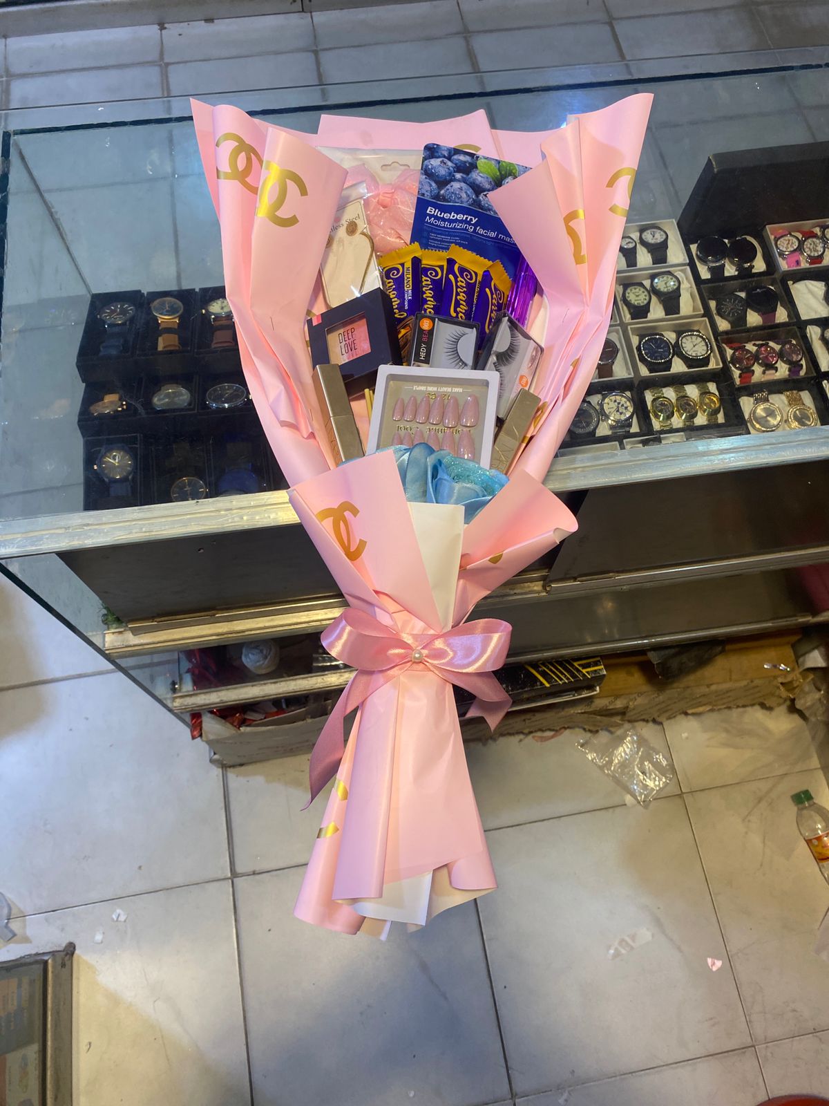 All items are wrapped together in a stunning pink bouquet style, combining beauty essentials with sweet treats for a truly memorable gift. 🌸